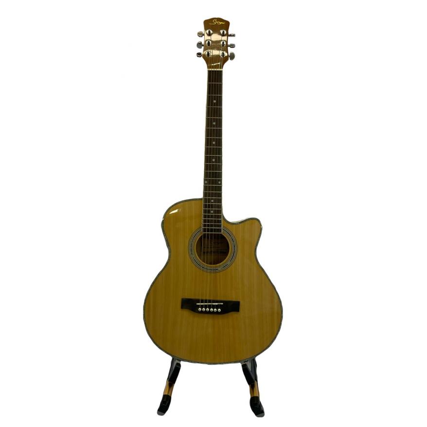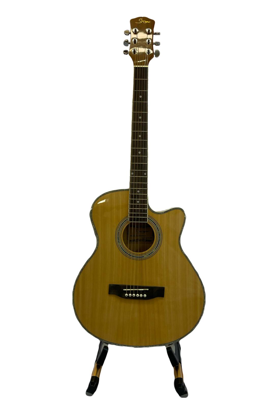 Guitarra acústica con cutaway florentino, tapa de picea alemana maciza, aros y fondo de arce figurado y mástil de caoba. acabado en color madera natural.