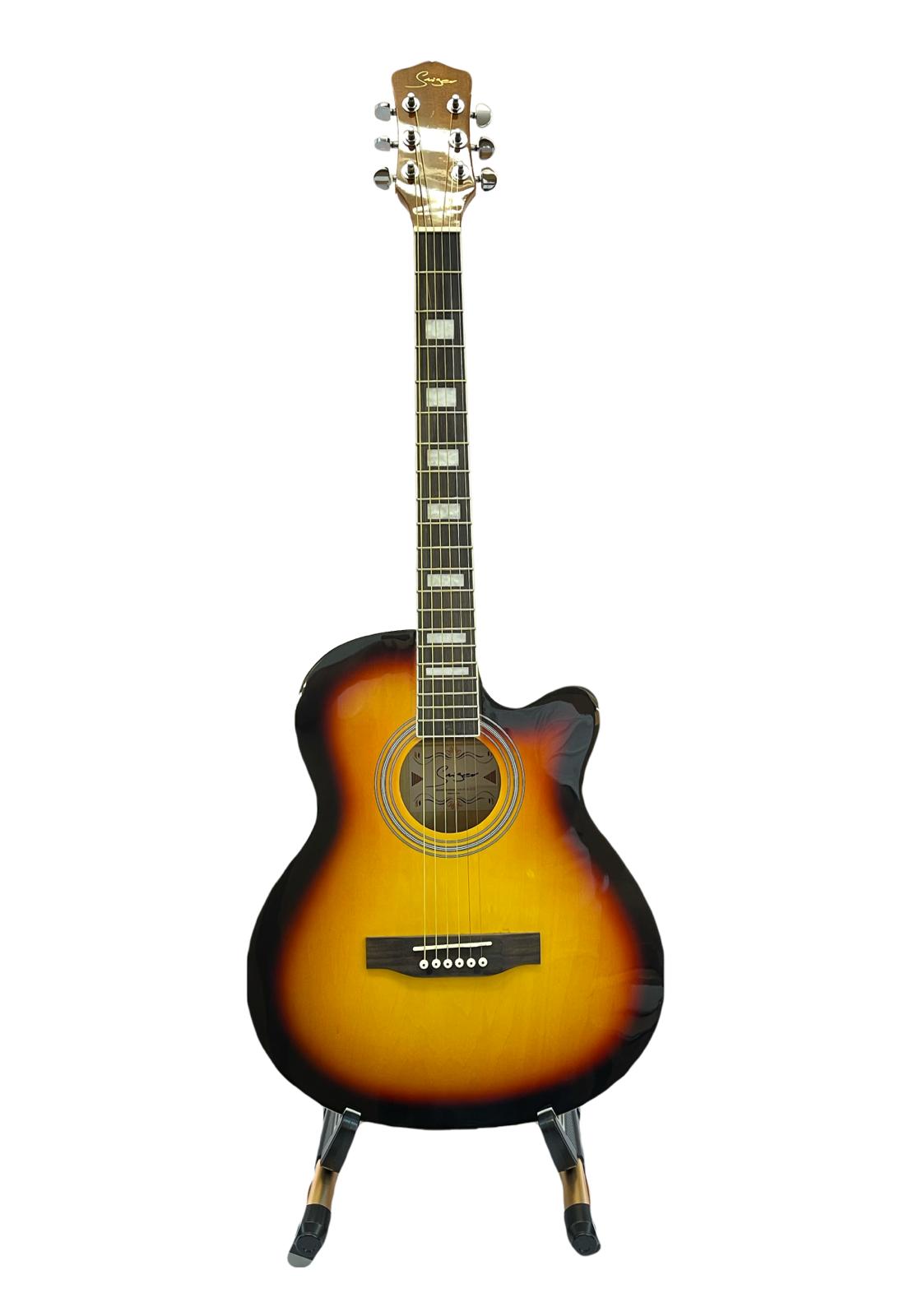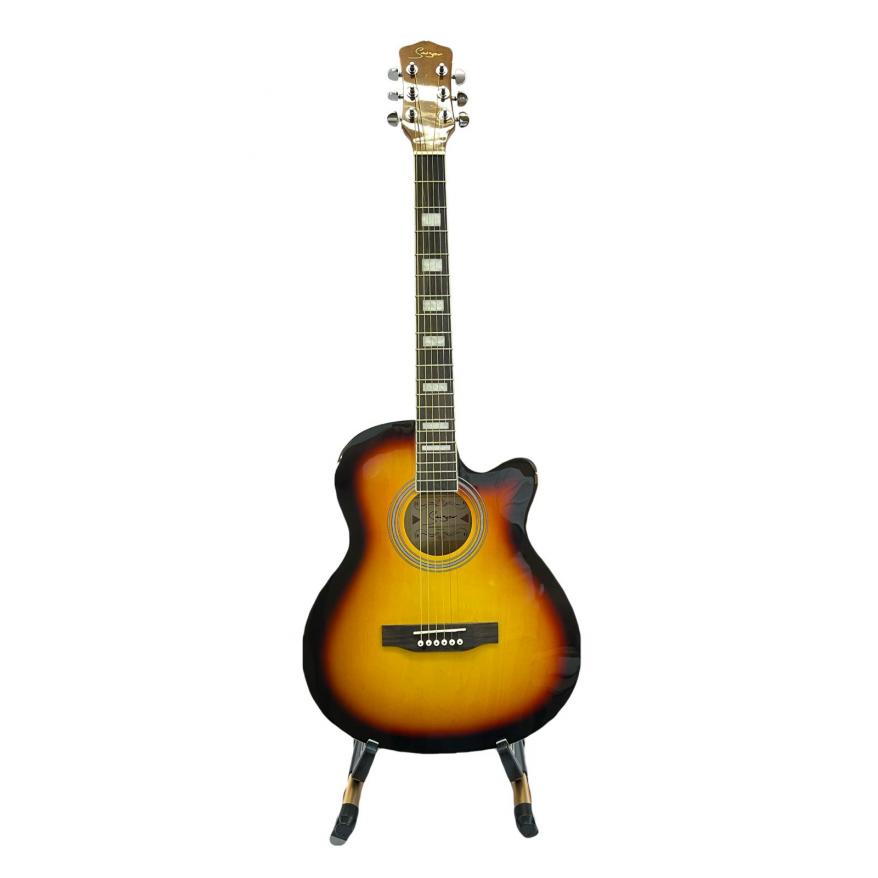 Guitarra acústica corte cutaway con tapa de pícela laminada, fondos y aros de natos laminados, diapasón de arce pintado con mecánica Die.Cast. Color Sunburst.
