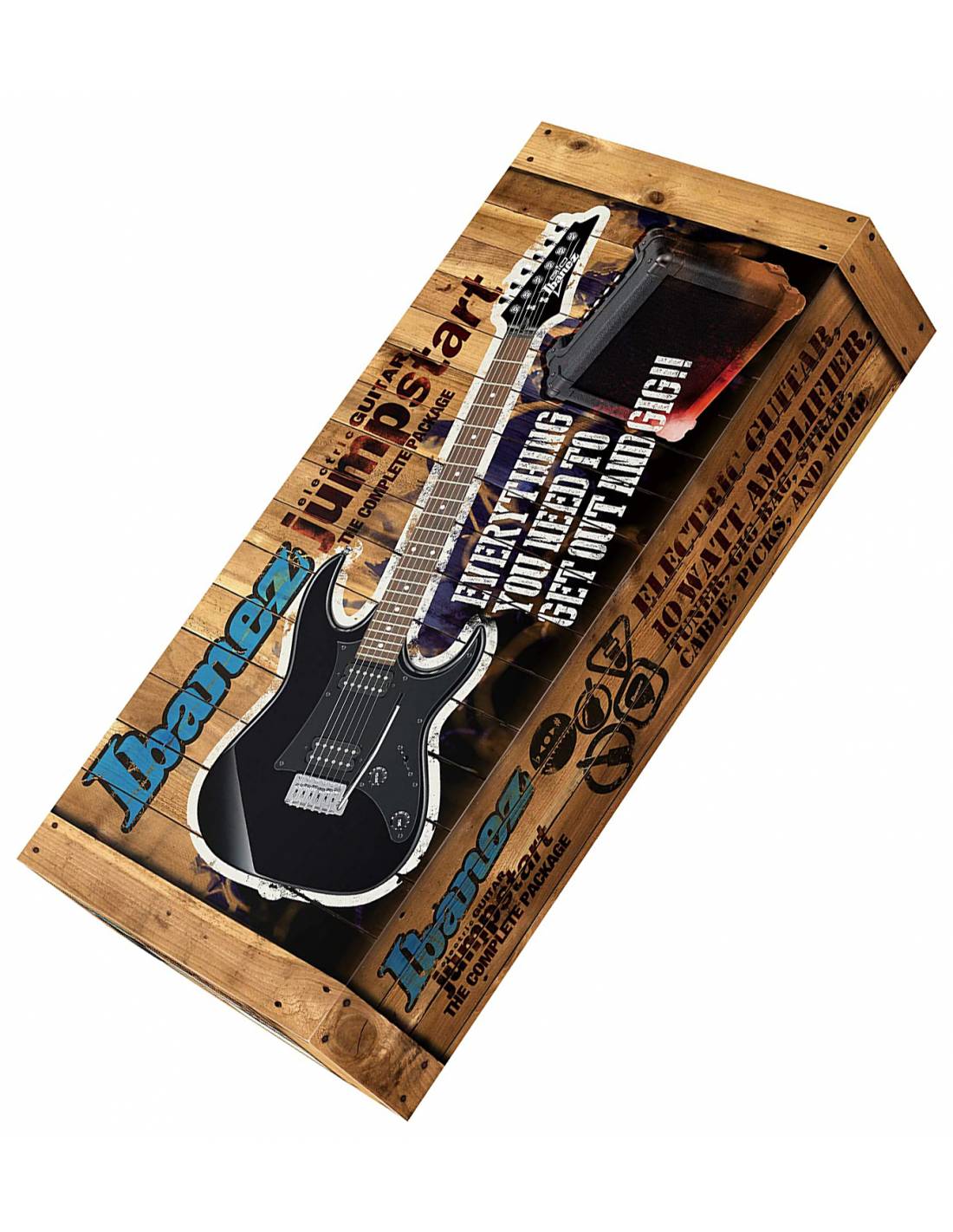 El pack de guitarra Ibanez Gio Jumpstart presenta las siguientes características: cuerpo de álamo, mástil de arce, diapasón de Jatoba, forma del mástil GRG, anchura de la cejilla de 42mm, 22 trastes médium, pastillas Humbucker infinity, controles de volumen y de tono e incluye amplificador de 10W, funda, afinador, cables y púas.