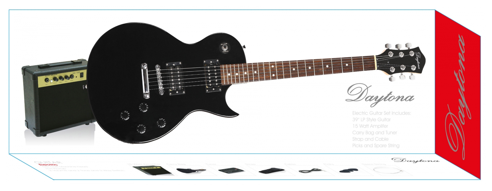 El pack de guitarra electrica Daytona Les Paul esta constituido por un amplificador de 15w, afinador, púas, correa, cables y funda.