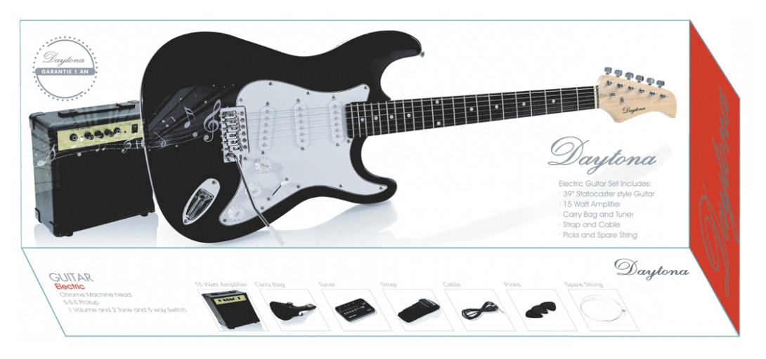 El pack de guitarra electrica Daytona Stratocaster esta constituido por un amplificador de 15w, afinador, púas, correa, cables y funda.