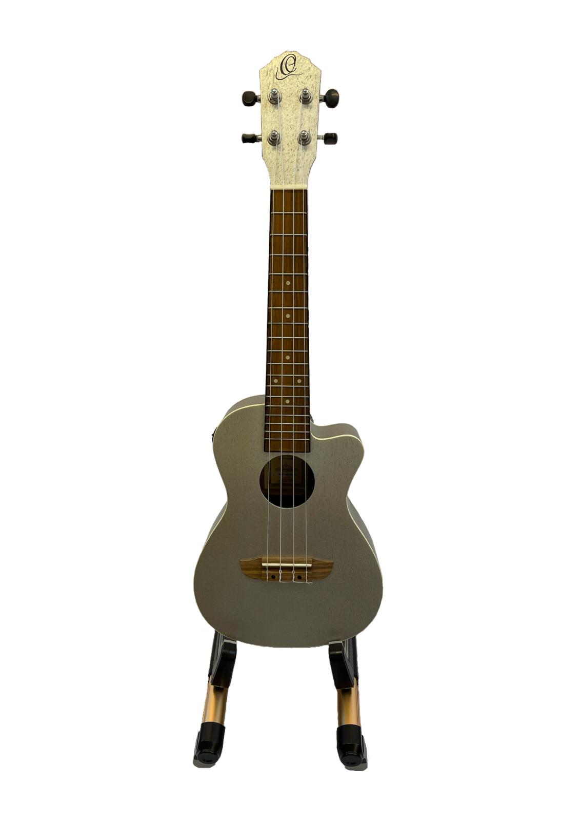 El ukelele de concierto Ortega Ruforest amplificado tiene las siguientes características: cuerpo de ocume, mástil de caoba, diapasón y puente de nogal, y acabado en color plateado.